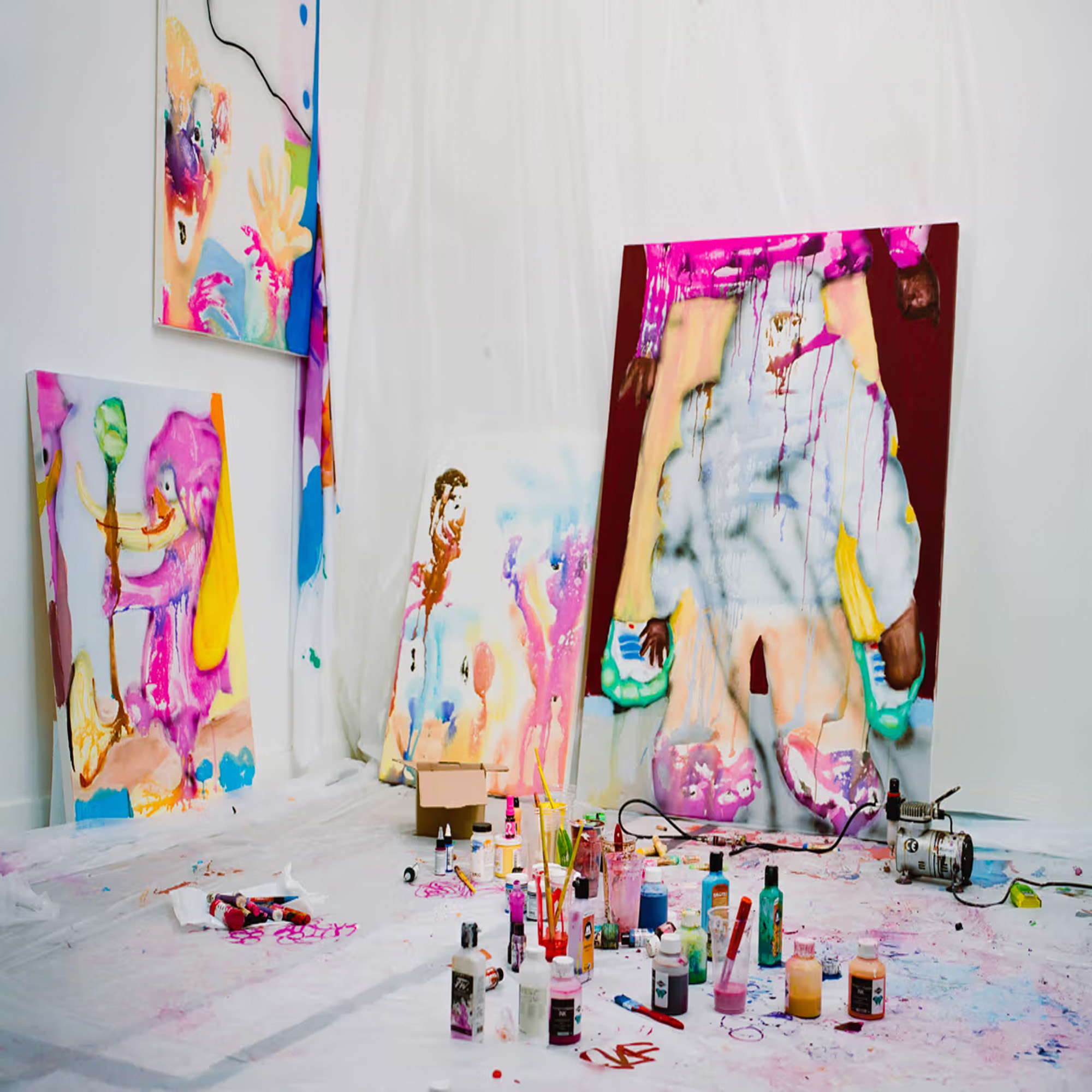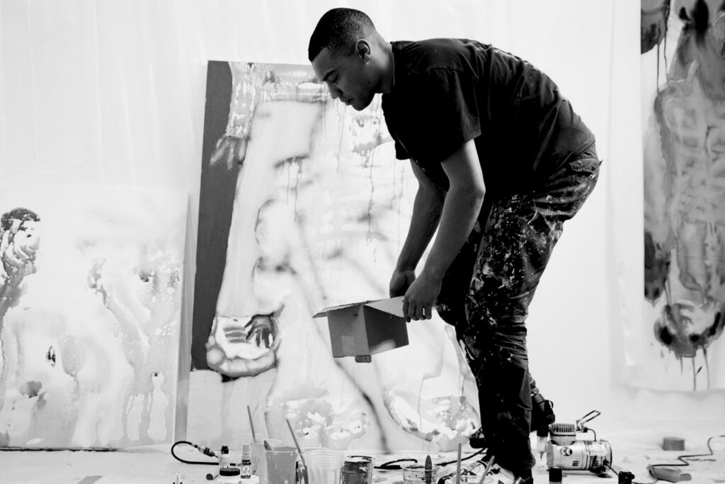 Alfie Kungu, a contemporary British artist born in Hebden Bridge in 1993, is celebrated for his playful paintings that mix figurative and abstract styles.