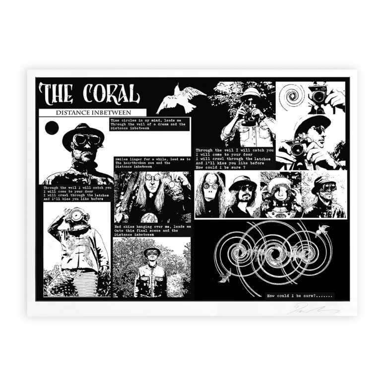 Straddling digital and analogue worlds, many songs on Distance Inbetween developed through texts and emails between James Skelly and Nick Power. Its unforced development was influenced equally by the nature of modern communication, their shared artistic desires and love for the static of rediscovered cassette tapes. Histories and influences, pieces of past are re-discovered and celebrated in many ways on Distance Inbetween, themes which are explored and exposed in The Coral’s first gallery event Distance Inbetween: The Exhibition at RedHouse Originals.